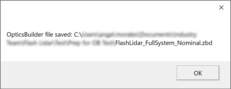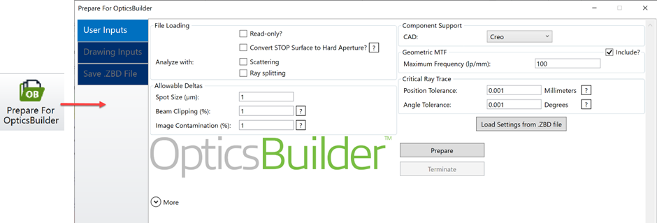 當完成 用戶輸入(User Inputs)選項卡的編輯后,我們選擇 準備(Prepare)以開始轉換過程,并讓工具檢查 ZBD 文件是否能夠在允許的增量和公差(在本例中,我們將其保留為默認值)范圍內執(zhí)行。在保存 .ZBD文件(Save .ZBD File)選項卡中單擊 保存(Save),以生成 OpticsBuilder 就緒文件。