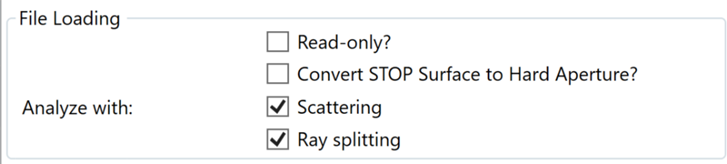 在 Prepare for OpticsBuilder 中,光學工程師可指定一些合適的設置,以檢查 ZBD 文件轉換是否保留了與原生 OpticStudio 文件相同的性能。對于閃光激光雷達系統(tǒng)的轉換,由于我們對光線分束和散射進行了建模,因此我們想要確保在 分析方式(Analyze With)設置中勾選 散射(Scattering)和 光線分束(Ray splitting)框。同樣地,在 OpticsBuilder 中是否將文件設為只讀也取決于工程師的選擇,對于本例,我們將不勾選只讀框: