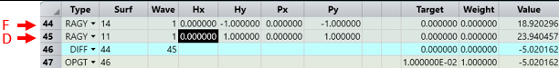 最后的約束條件是點(diǎn) F(邊緣光線穿過表面 14)的 Y 位置必須大于點(diǎn) D 的 Y 位置,如下圖所示。為了得到點(diǎn) F 的位置,我們需要使用虛擬曲面 14: