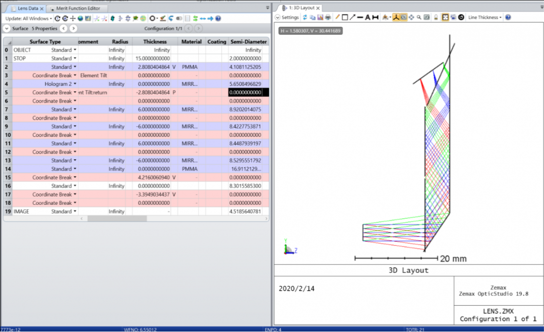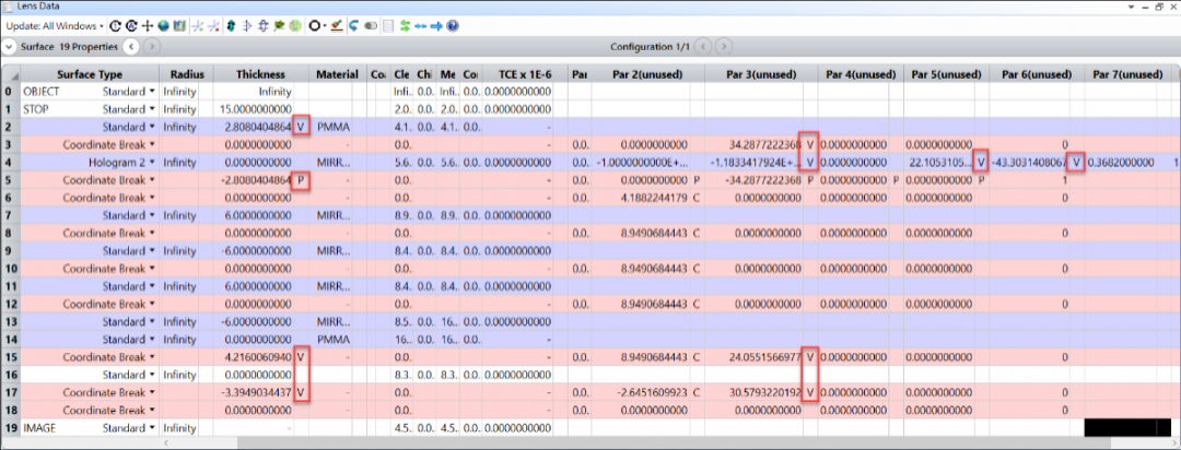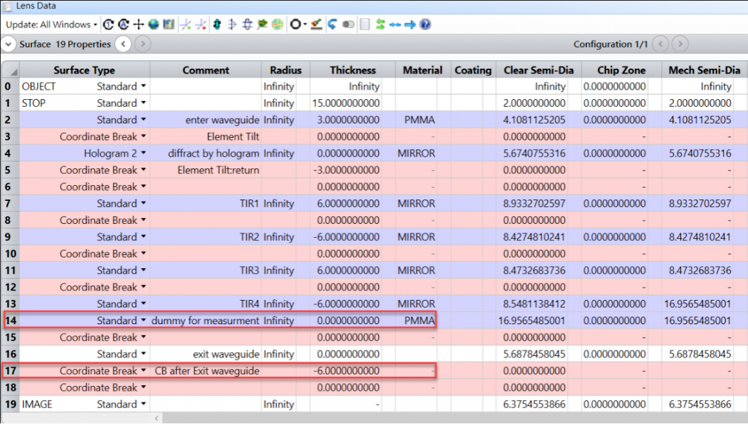 為了便于優(yōu)化,我們首先在表面 13(設(shè)置材料為 PMMA)之后添加一個(gè)虛擬面。這個(gè)曲面將被用作一個(gè)參考曲面,以確保系統(tǒng)的幾何形狀是正確的。接下來,在表面 17 的波導(dǎo)出口之后添加一個(gè)坐標(biāo)間斷面,然后將現(xiàn)有的表面厚度剪切并粘貼到新的坐標(biāo)間斷面厚度,這個(gè)新表面將用于傾斜像面。