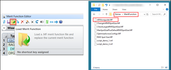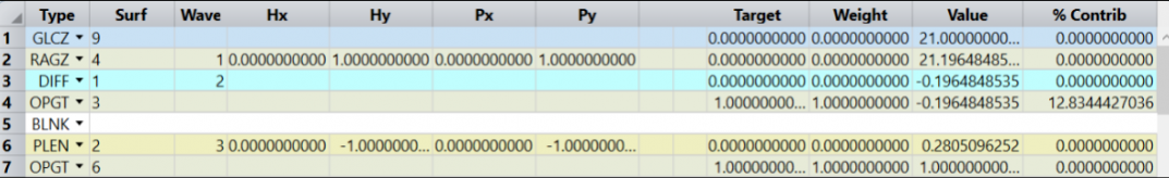 在添加曲面和設(shè)置變量后,下一步是利用評(píng)價(jià)函數(shù)來實(shí)現(xiàn)對(duì)系統(tǒng)的真實(shí)控制。我們使用光斑大小作為標(biāo)準(zhǔn)建立了默認(rèn)評(píng)價(jià)函數(shù),并為表面的位置上添加詳細(xì)的限制。所有新添加的操作數(shù)都是為優(yōu)化程序提供一個(gè)物理上實(shí)用的解決方案。你只需要下載文件“ ARWaveguide.MF ”并復(fù)制到 Documents\Zemax\MeritFunction 文件夾中,然后從評(píng)價(jià)函數(shù)編輯器中使用載入評(píng)價(jià)函數(shù) (Load Merit Function)按鈕。下面的步驟描述了所有構(gòu)成此評(píng)價(jià)函數(shù)的操作數(shù)。