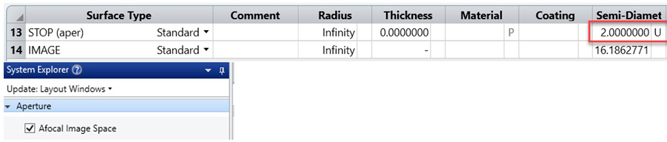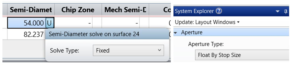 ?表面24是新的STOP表面。首先可以固定表面24的半直徑,將“孔徑”更改為“按光闌大小浮動(dòng)”,然后將“STOP”表面設(shè)置為表面24。
