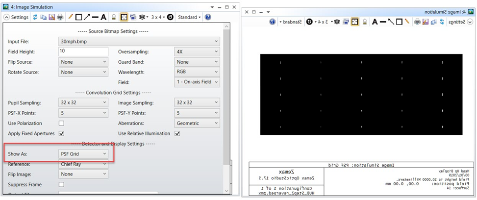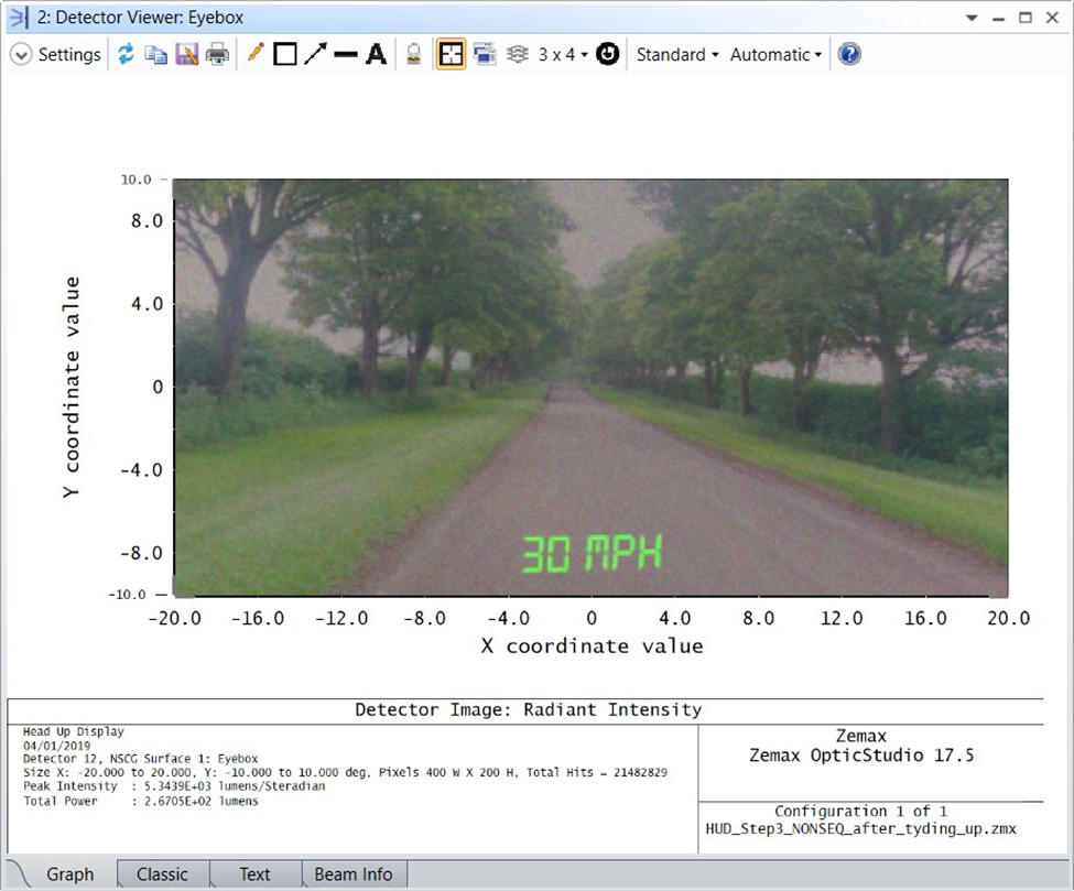 可以使用Detector Viewer顯示駕駛員看到的模擬圖像。首先單擊 Analyze > Ray Trace 執(zhí)行光線追跡,然后設(shè)置“光線追跡控制”,如下所示。然后通過(guò)單擊 Analyze > Detector Viewer 來(lái)查看探測(cè)器查看器。在“設(shè)置”菜單下,設(shè)置“顯示為:真彩色”和“顯示數(shù)據(jù):角度空間”。角度空間是序列非無(wú)焦像空間設(shè)置的非序列同等形式設(shè)置。這里使用它是因?yàn)槿搜勰P蜎](méi)有在這個(gè)系統(tǒng)中建模。