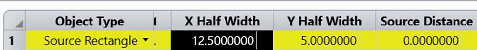 ?只保留一個(gè)光源:以視場(chǎng)1為中心,第4行的橢圓光源。刪除所有其它光源(第1行至第3行和第5行至第12行)。將該光源更改為“矩形光源”,其寬度為±12.5mm,尺寸為±5mm。將布局光線的數(shù)量設(shè)置為10: