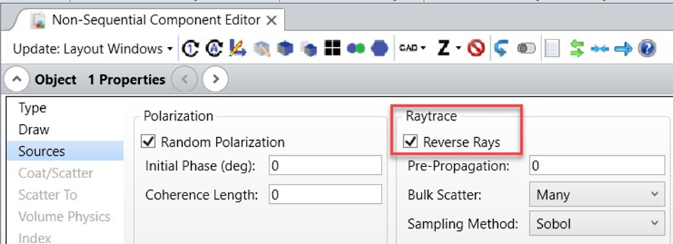 三維布局顯示“光源”位于矩形體積內(nèi),矩形體積是布爾體的父對(duì)象之一。在這種情況下,需要啟用Source的Inside Of f標(biāo)識(shí)才能指向布爾對(duì)象。還需要在NSCE(非序列數(shù)據(jù)編輯器)中的布爾物體之后定義光源,以便內(nèi)部能正常工作。