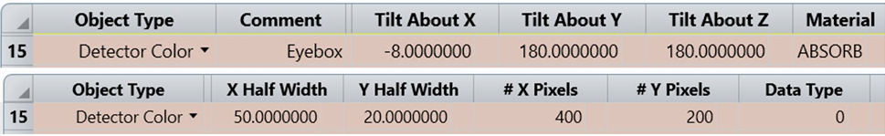 ?將Eyebox(第15行)更改為Detector Color(檢測(cè)器顏色),并添加約為-8度的Tilt(傾斜)X。速度將顯示在Detector Color的底部。眼盒尺寸為X半寬=50mm,Y半寬=20mm。將X中的像素?cái)?shù)設(shè)置為400,將Y中的像素?cái)?shù)目設(shè)置為200。此外,Detector Color半角設(shè)置為X 20度和Y 10度,并且添加了180度的傾斜Y和傾斜Z,使得最終圖像在右方向上顯示。