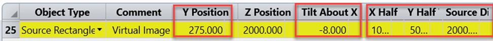?將檢測(cè)器25更改為矩形光源,并將注釋更改為“虛像”。添加-8度的“傾斜X”,并將“Y位置”更改為275 mm,以使其位于探測(cè)器的中心。