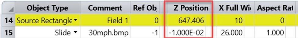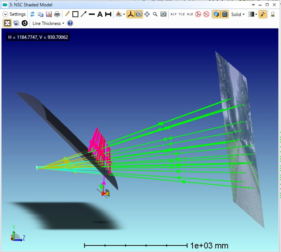 ?虛擬圖像處的矩形光源(物體#17)將用于模擬建立太陽(yáng)光照射。添加一個(gè)幻燈片物體以表示司機(jī)看到的背景場(chǎng)景(Object Properties >Sources> Raytrace> Reverse Rays,以便光線向探測(cè)器發(fā)射)。將“幻燈片X全寬”設(shè)置為2000 mm,將“縱橫比”設(shè)置為1.0。