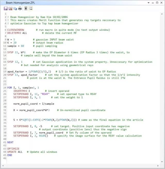 如果想要優(yōu)化其他束腰為 W 的輸入光和平頂半徑為 K 的輸出光,你可以在宏程序中更改相應(yīng)的變量即可。