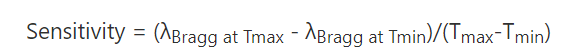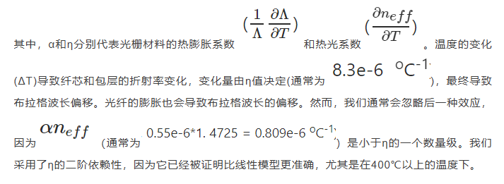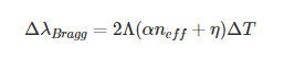 上述方程可以擴展為包括溫度(T)對折射率的影響,從而包括布拉格波長: