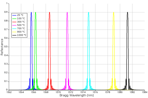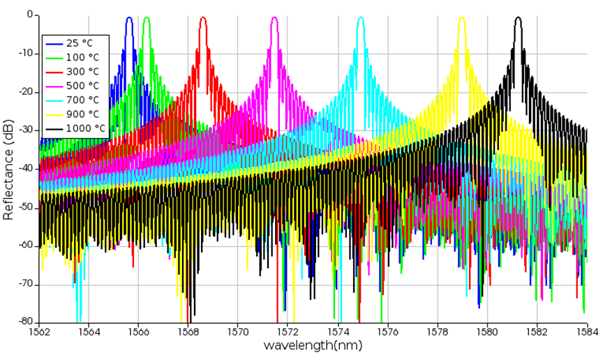 下圖顯示了25℃至1000℃溫度范圍內(nèi)的光譜。根據(jù)文獻顯示,在100℃至500℃的溫度范圍內(nèi),布拉格波長偏移為4nm。我們的模擬結果顯示,在相同的溫度范圍內(nèi),4.5nm的數(shù)值相似。