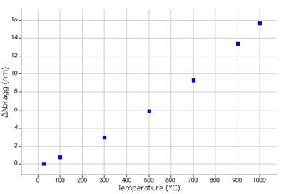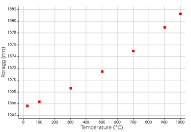 布拉格波長與溫度的關系如圖顯示,相對于室溫下的值,其在1.000攝氏度時偏移15.6納米。