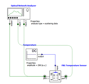 該示例演示了一種基于光纖布拉格光柵(FBG)的溫度傳感器,因為光纖折射率會隨溫度而變化,導致其布拉格波長發(fā)生偏移,所以可以被用作溫度的測量。
