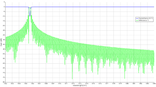 使用光學時間調(diào)制 S 參數(shù)元件將與溫度相關的S參數(shù)導入 INTERCONNECT,用于模擬 FBG 溫度傳感器。我們掃描溫度并測量傳感器在不同溫度下的反射光譜。當需要附加 PIC 元件對 FBG 的整體性能的影響時,該電路模型仿真是有用的。