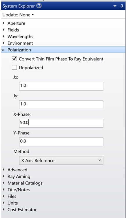 首先,我們要設(shè)置入射光線的偏振態(tài)。在 “System Explorer” 的 “Polarization” 選項(xiàng)卡中,取消選中 “Unpolarized” 并將偏振態(tài)設(shè)置為右旋圓偏振光,如圖 6 所示。
