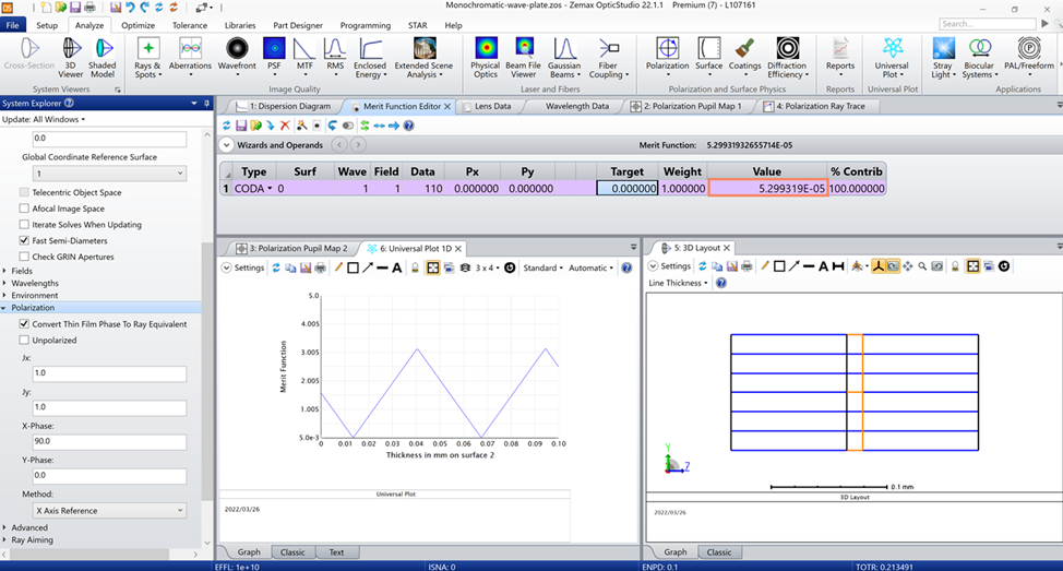 此處加一注釋。波片的厚度可以在計(jì)算值的基礎(chǔ)上再度優(yōu)化。對(duì)此,我們可以將 CODA 操作數(shù)的權(quán)重更改為 1,并將表面 2 的厚度設(shè)置為變量。