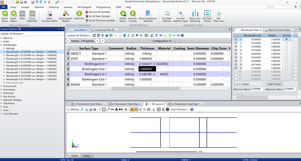現(xiàn)在,讓我們?yōu)閷拵Ч庠唇O畈ㄆ?。在附件中可以找到一個(gè)名為 “Achromatic wave plate.ZAR” 的示例文件。消色差波片可以被視為與消色差透鏡功能相同,即兩個(gè)或多個(gè)不同材料的波片組合起來可以抵消色散。