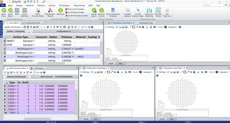 圖 8 顯示了如上條件下的鏡頭數(shù)據(jù)編輯器、3D 布局和偏振光瞳圖。