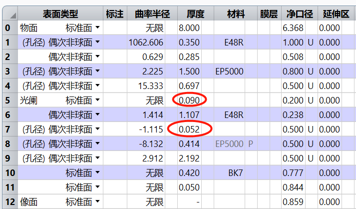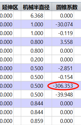 再看到鏡頭數(shù)據(jù)編輯器的圓錐系數(shù)列,如下圖所示,可以看到其中一個透鏡的圓錐系數(shù)的數(shù)值為-306.353,在實際的生產(chǎn)制造中,如果將圓錐系數(shù)控制在-100到100這個范圍當中會比較利于生產(chǎn)加工,因此我們也可以對這個圓錐系數(shù)進行優(yōu)化。