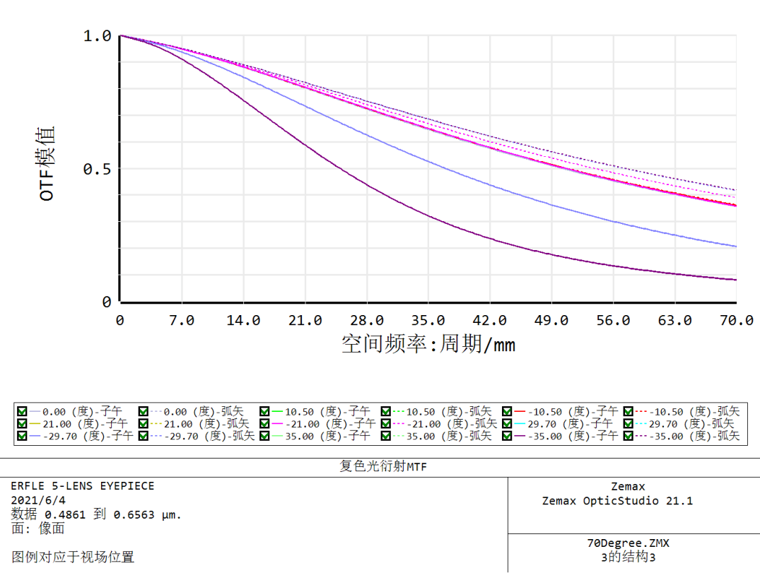 點擊打開當前系統(tǒng)的 MTF 曲線。通常情況下,我們會需要根據(jù) CCD/CMOS 探測器對應(yīng)的響應(yīng)頻率設(shè)置 MTF 的空間頻率進行曲線觀察,在這里我們選擇 MTF 的空間頻率顯示至 70周期 /mm。