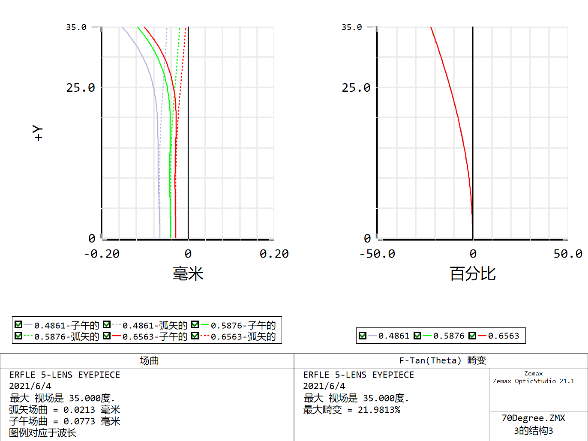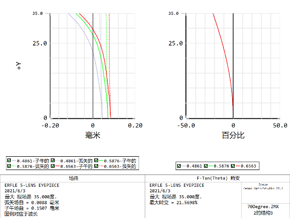 點擊分析-像差分析-場曲 / 畸變功能,分別選擇不同的結(jié)構(gòu),可得到如下圖所示的畸變曲線: