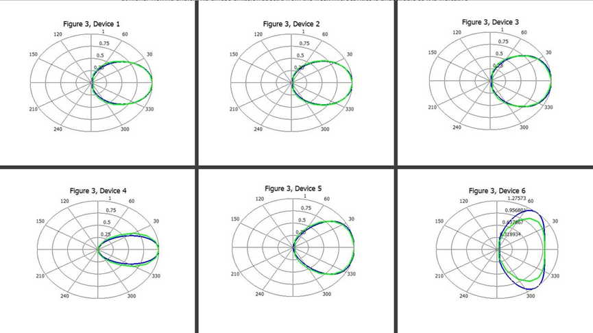 下圖表示器件在極坐標(biāo)下的歸一化場(chǎng)型,藍(lán)色曲線是 STACK 求解器的結(jié)果,與文獻(xiàn)的綠色曲線相當(dāng)一致。也可從器件4-6中觀察到微腔效應(yīng)如何影響視角范圍。