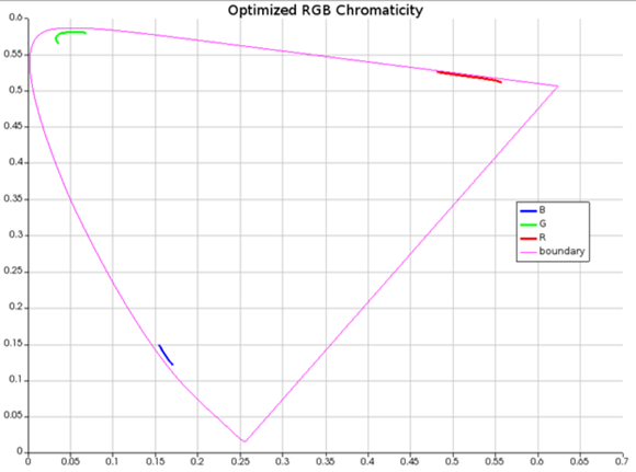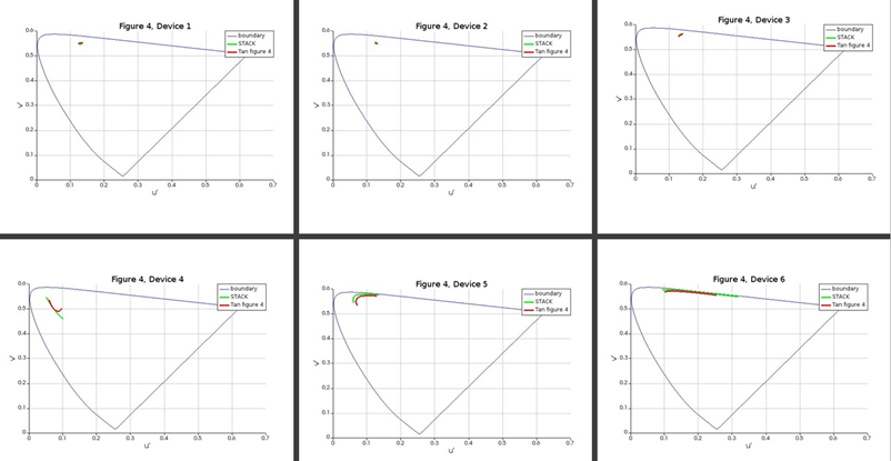 在 u' 和 v' 的圖中,我們可以看到存在一些不可避免的顏色偏移。但與我們上一步分析的測(cè)試設(shè)備相比,優(yōu)化后的設(shè)備表現(xiàn)較佳。