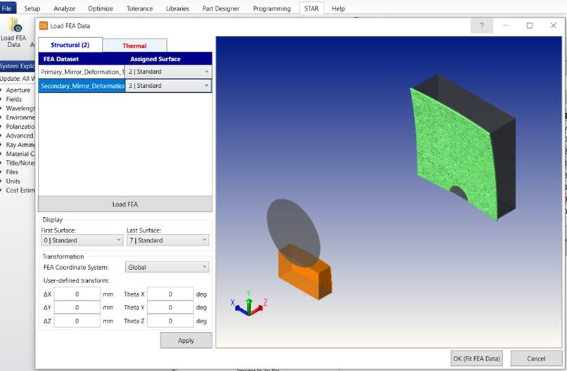 接下來需要采取幾個步驟才能將FEA數(shù)據(jù)正確加載到 STAR 中。首先,可以使用加載 FEA 數(shù)據(jù)工具導(dǎo)入文本文件。該工具將打開一個窗口,可以在其中加載結(jié)構(gòu)和熱數(shù)據(jù)集并將其分配給相應(yīng)的光學(xué)表面。在本例中,兩個透鏡在12℃時的結(jié)構(gòu)數(shù)據(jù)已加載到 STAR 模塊中。