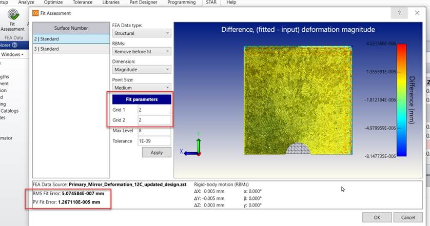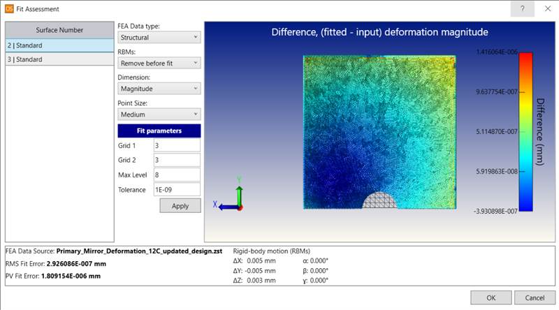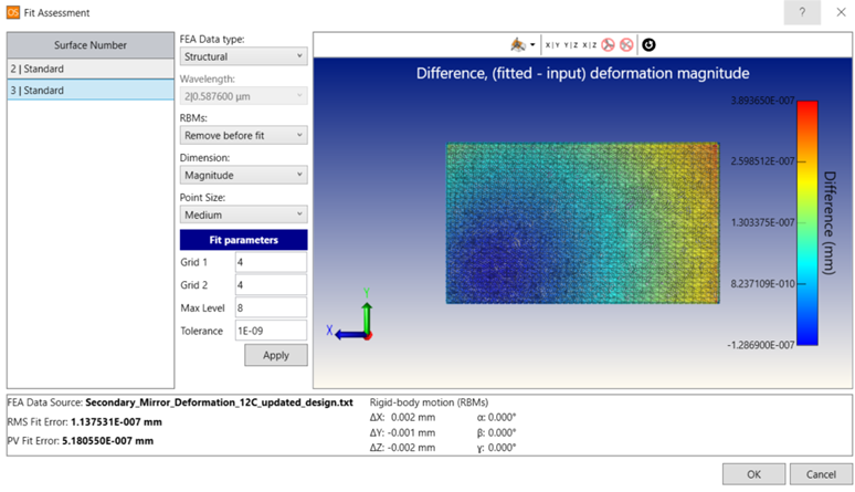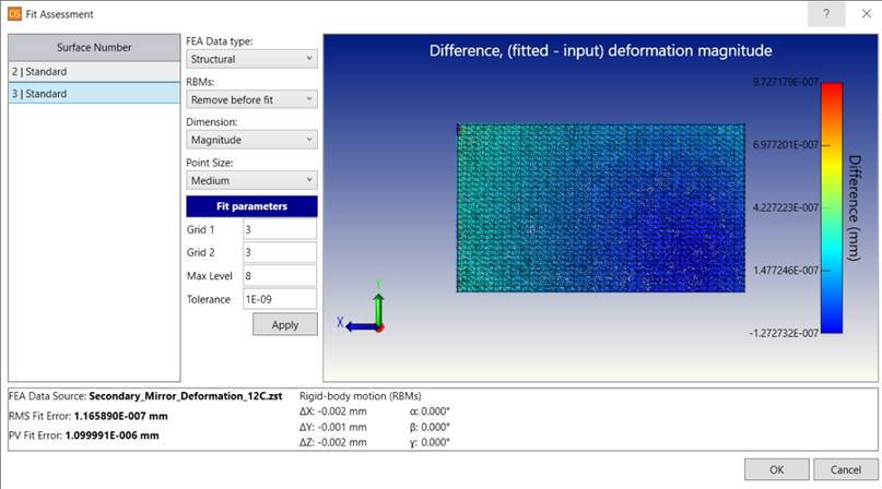 準備好數(shù)據(jù)后,就可以擬合有限元分析數(shù)據(jù)。使用擬合評估工具,可以針對每個光學(xué)表面獨立調(diào)整數(shù)據(jù)的擬合參數(shù),直到獲得準確的擬合。圖 2 顯示了結(jié)構(gòu)變形數(shù)據(jù)如何適應(yīng)主鏡的默認設(shè)置。使用此工具,可以查看 RMS 和 PV 擬合誤差,并可以調(diào)整擬合參數(shù)以最小化該誤差。