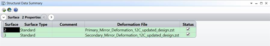 現(xiàn)在,我們可以通過應(yīng)用結(jié)構(gòu)變形數(shù)據(jù)集來分析系統(tǒng)在所有工作溫度下的光學(xué)性能。所有結(jié)構(gòu)有限元分析數(shù)據(jù)集都可以在 STAR 選項卡中的結(jié)構(gòu)分析總結(jié)工具中查看。從這里,可以打開或關(guān)閉數(shù)據(jù)集,以檢查來自任何感興趣表面的結(jié)構(gòu)變形效應(yīng)。
