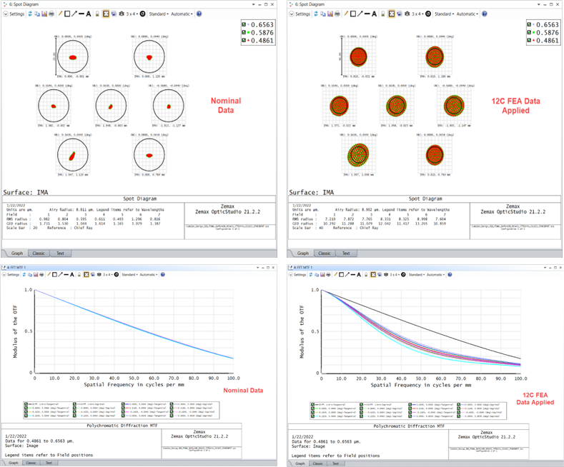 對于以下圖,使用了 12℃ FEA 數(shù)據(jù)集,因為它導(dǎo)致立方體衛(wèi)星的性能與標稱值差異最大。以下點圖和 FFT MTF 圖顯示了應(yīng)用結(jié)構(gòu)變形數(shù)據(jù)時對性能的負面影響。