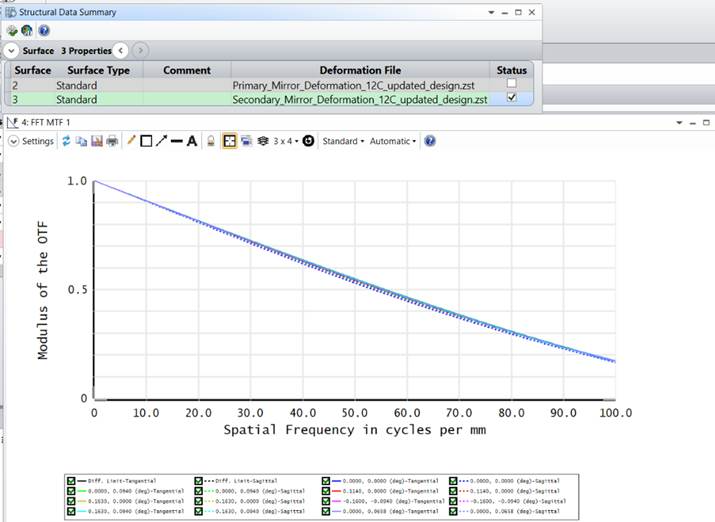 由于具有將 FEA 數(shù)據(jù)互換并應(yīng)用于序列模式 OpticStudio 模型的能力,因此可以很容易的解釋 FEA 數(shù)據(jù)對系統(tǒng)性能的影響。通過將特定的FEA數(shù)據(jù)集應(yīng)用于模型,可以獲得更進一步的見解。在圖 7 中,僅應(yīng)用了次鏡的結(jié)構(gòu)變形數(shù)據(jù)。應(yīng)用這些數(shù)據(jù)并查看 FFT MTF 圖可以證實,系統(tǒng)性能下降主要是由本設(shè)計的主鏡引起的。