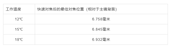 這表明探測器的最佳聚點位置與溫度呈線性關(guān)系。為了在軌道上獲得最佳性能,探測器可以放在主鏡后方6.845mm處。這相當于從21℃最佳對焦位置移動了-0.173mm。