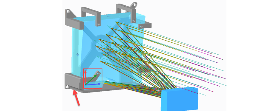 如圖3和圖4所示,主鏡和次鏡的變形幅度分布方向相反(主鏡的左下角和次鏡的右下角)。為了保持兩反射鏡的相對變形并保持形變載荷的平衡,實施機械設(shè)計改進,將機械止動面(放置在固定器上的反射鏡表面)調(diào)整到反射鏡的另一個底角上。通過實施此更改,兩個鏡像現(xiàn)在可以有一個相對于彼此相同方向的載荷分布。下圖(圖 10)用紅色標記的坐標系表示了這一點。