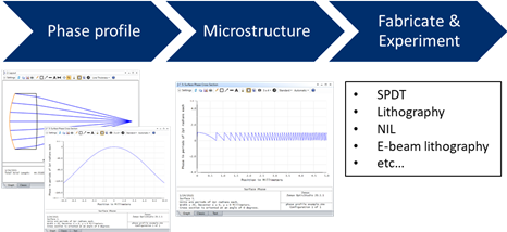 在這一過(guò)程中,用戶首先將 DOE/metalens 等效為其對(duì)應(yīng)的相位面來(lái)在 OpticStudio 中用光線追跡的方法進(jìn)行設(shè)計(jì)。然后根據(jù)得到的相位分布來(lái)設(shè)計(jì)微結(jié)構(gòu)。圖1顯示了該過(guò)程的流程圖。該圖不包括設(shè)計(jì)的細(xì)節(jié),例如,微結(jié)構(gòu)可以是傳統(tǒng)閃耀光柵或現(xiàn)代超透鏡。根據(jù)微結(jié)構(gòu)的類型,所需的設(shè)計(jì)和制造方法可能非常不同。