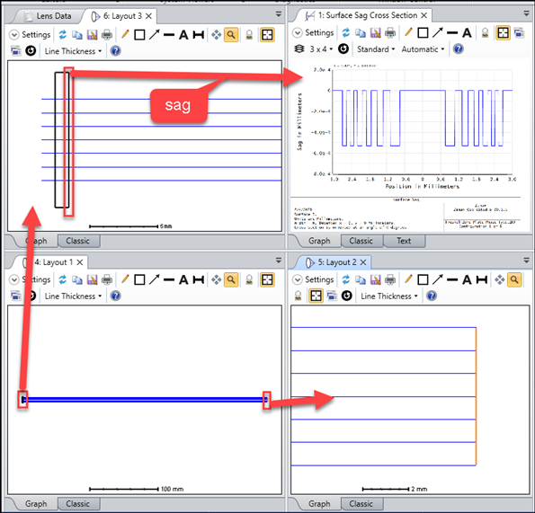 除了光柵常數(shù)的限制外,這種方法的另一個(gè)缺點(diǎn)是,設(shè)計(jì)者可能仍然需要定制一些工具,以增強(qiáng) OpticStudio 提供的功能。例如,目前沒(méi)有支持參考文獻(xiàn)[4]中所述的閃耀 Sag 的原生面型。用戶需要?jiǎng)?chuàng)建自己的序列面 DLL,以模擬特殊的表面 Sag 分布。此外,目前 OpticStudio 不支持顯示橫截面 PSF,例如,Y-Z 平面,需要一個(gè)宏來(lái)掃描不同Z位置的 PSF 并創(chuàng)建參考文獻(xiàn)[4]中所述的圖。