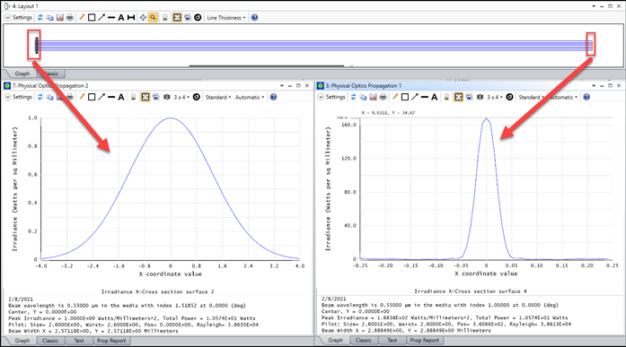 然而,如果現(xiàn)在用 POP 對(duì)同樣的情況進(jìn)行建模,就會(huì)發(fā)現(xiàn)光束會(huì)在圖像表面處聚焦,如圖4所示。在這里,我們從束腰為2.6mm的高斯光束開(kāi)始,將光束聚焦為束腰約為0.4mm的光斑。這個(gè)例子表明,這種類型的結(jié)構(gòu)只能用 POP 進(jìn)行模擬。