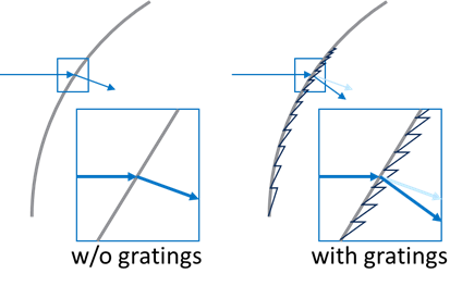 圖8:光柵可以被制作成傳統(tǒng)的二元光柵、閃耀光柵或超透鏡(metalens)