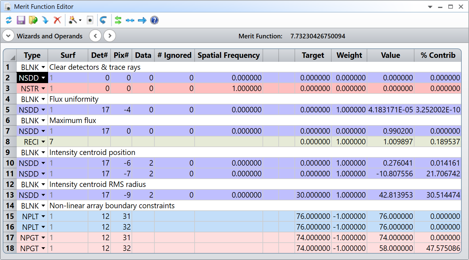 用操作數(shù)5和8分別用于最大化空間均勻性和總光通量,用操作數(shù)10和11來控制光強分布的質(zhì)心,用操作數(shù)13用來控制光強分布的均方根半徑。希望輸出光線不是完全平行的,而是限制在一定的視角范圍內(nèi),因此,指定了30°作為目標視角。最后一組操作數(shù) (15-18) 是邊界約束,以防止陣列變得太大或太小,當無邊界約束時,優(yōu)化會有產(chǎn)生極限解的趨勢。注意這些操作數(shù)的負數(shù)權(quán)重,它們就像拉格朗日乘數(shù)一樣工作,迫使目標得以實現(xiàn)。