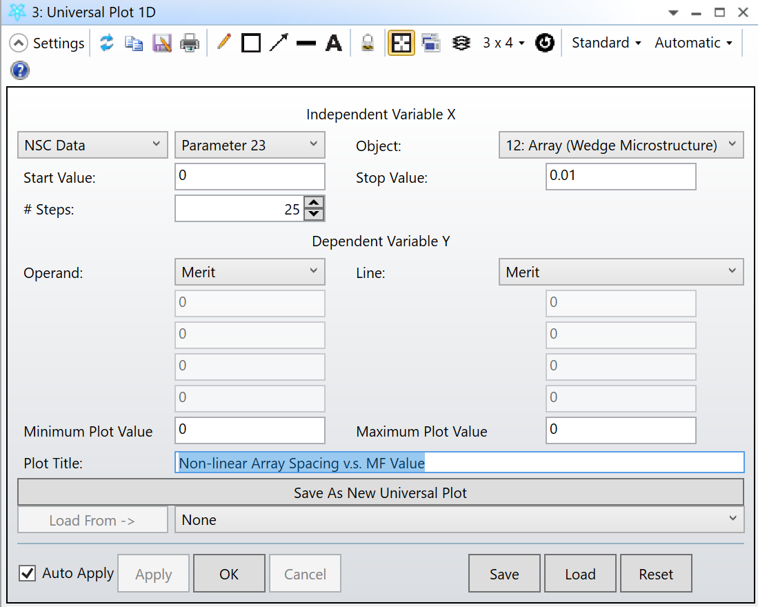 如果給變量一個有限初始值,而不是從零開始,通常會使優(yōu)化更有效。為了確定二階y方向的起始點,查看通用繪圖并與評價函數(shù)中的值進行對比。打開一維通用圖(分析 (Analysis) >通用繪圖 (Universal Plot))并應用以下設置。