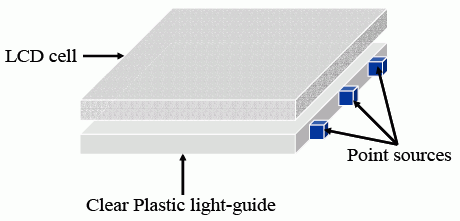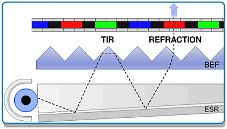 光源通常是冷陰極熒光燈管 (CCFL) 或一系列發(fā)光二極管 (LED) ,且在光源的后面放置反射器可以提高系統(tǒng)的效率。楔形光波導利用全內(nèi)反射 (TIR) 使光更均勻地分布在顯示區(qū)域。用反射鏡圍繞光波導,也可以提高系統(tǒng)效率。使用不同增亮膜 (BEF) 的陣列模式,可用于控制發(fā)射光的發(fā)光強度和偏振特性。