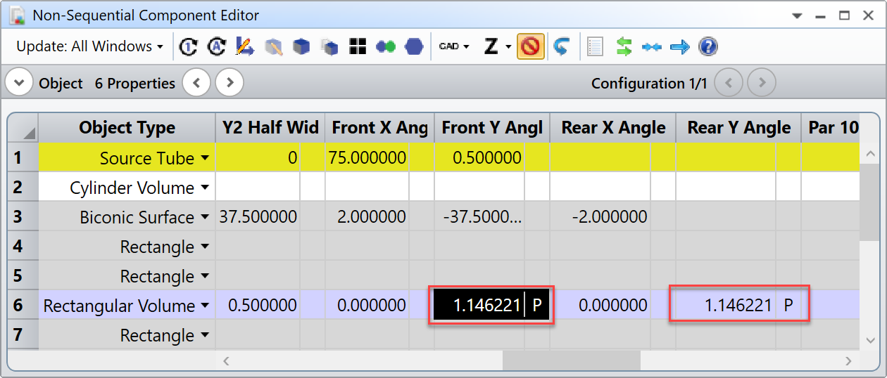 使用由丙烯酸材料制成的矩形體物體建立楔形光波導模型。該物體可以存在不同的端面尺寸和傾斜。請注意,只有傾斜物體才能保持光波導的上表面與X-Z平面平行。由于物體是圍繞光波導輸入面的中心旋轉(zhuǎn),而不是頂部邊緣,所以Y的位置也需要略做改變。在物體傾斜的前后表面上都設置拾取 (Pickup) 求解以確保他們與Y-Z平面保持平行。