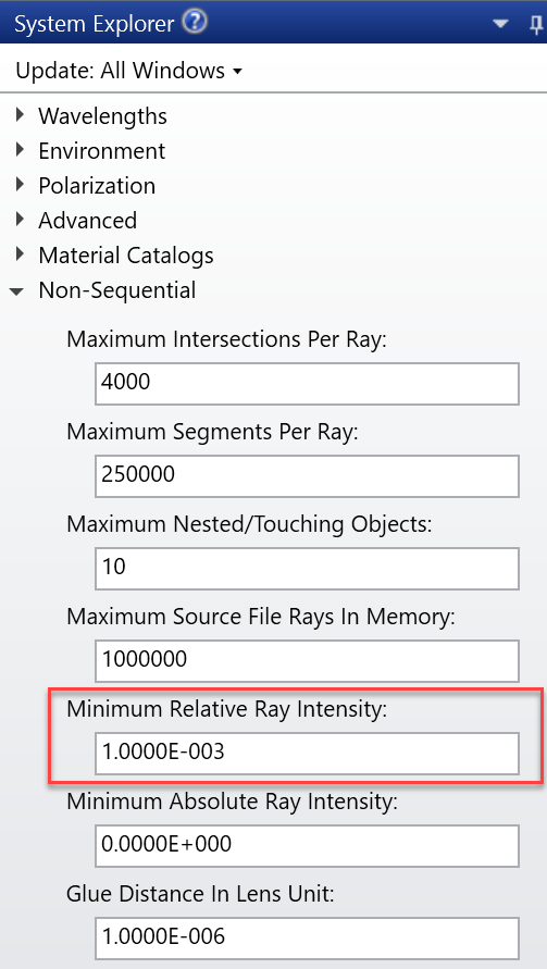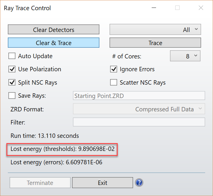 使用下圖所示的光線追跡控件 (Ray Trace Control) 進行光線追跡的相關(guān)設置,并注意閾值造成的能量損失。