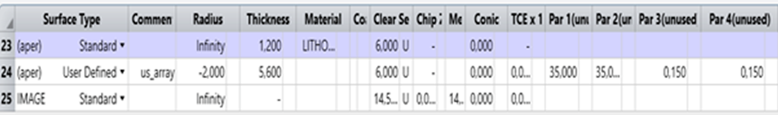 Shack?Hartmann 使用用戶定義的表面進行建模:us_array.dll。在參數(shù) 3 和 4 中設置150 μm的間距。微透鏡的材料、厚度和半徑的定義方式與標準表面相同。由系統(tǒng)的像平面表示的成像傳感器位于微透鏡的后焦距處。有關us_array.dll的更多參數(shù)信息可以在 OpticStudio 的幫助系統(tǒng)中找到。