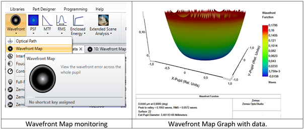 第一項分析可以通過分析Shack-Hartmann入口處的波前(surface 22)來進行。波前圖展示了歸一化出射光瞳的波前與表面22處的平面波之間的波差異。這些數(shù)據(jù)可以根據(jù)波前圖功能區(qū)中顯示的出瞳直徑(以毫米為單位)和系統(tǒng)選項中使用的波長進行縮放。波前圖功能區(qū)可以顯示波前均方根 (RMS) 值和峰谷值 (PV)。