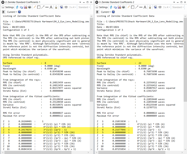 現(xiàn)在也可以在表面 22 處讀取在角膜后面為正常眼睛建立的以下Zernike 多項式,如下圖所示: