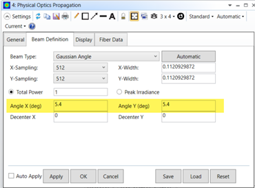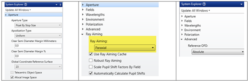 在光線瞄準下,光線瞄準設置為近軸,以便更可靠地填充光闌,特別是在高像差的情況下。有關此選項的更多信息,請參閱知識庫文章如何使用光線瞄準。
