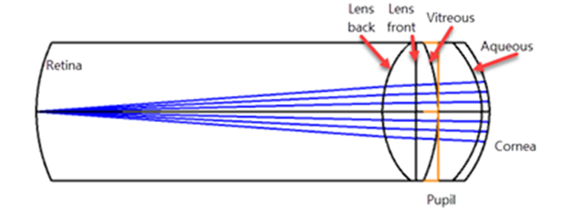 對于建模來說,系統(tǒng)可以分解為三個部分:人眼建模、采集光學系統(tǒng)和Shack-Hartmann傳感器。本文將描述每個部分的建模以及評估系統(tǒng)性能的分析工具。