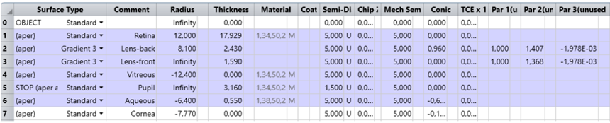 Ansys Zemax | 如何在 OpticStudio 中模擬人眼視網(wǎng)膜中心設置為物體位置(surface 0),光闌固定在眼睛瞳孔(surface 5)處,并根據(jù)外部環(huán)境給定直徑在2到8mm之間變化。