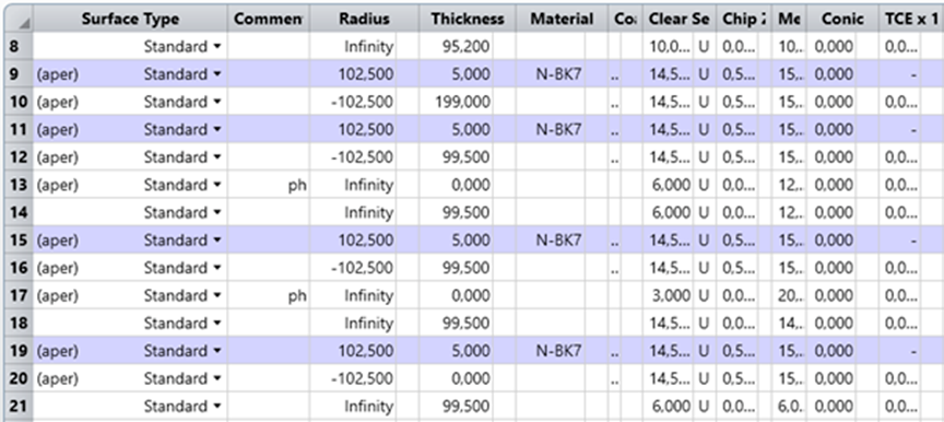 真實鏡片的設計如下面的鏡頭數(shù)據(jù)編輯器界面所示。